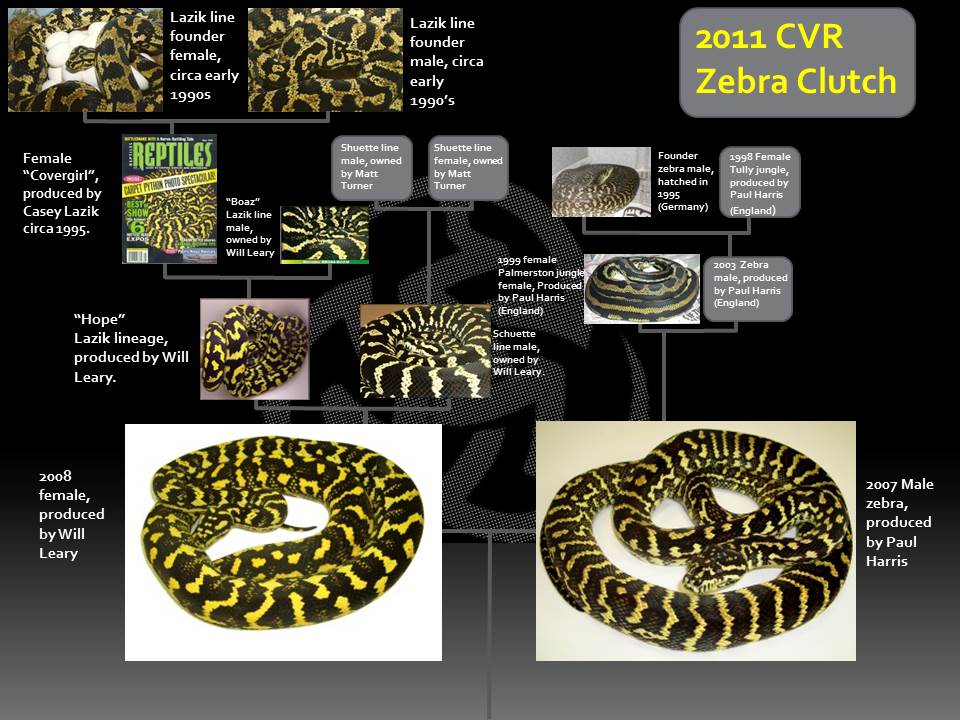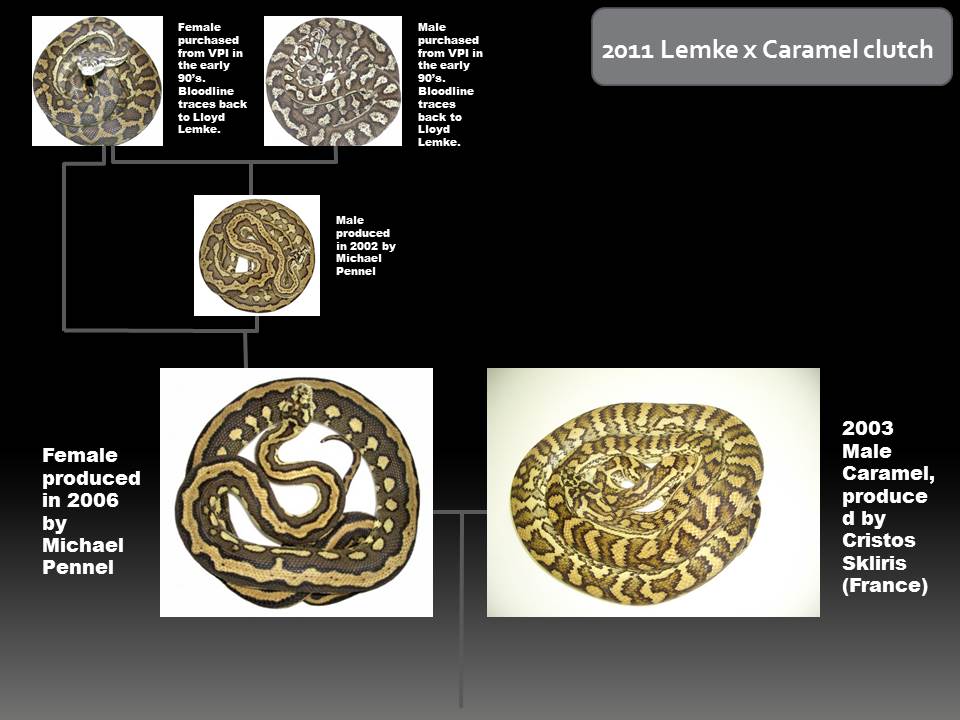 Here is the list of my 2011 clutches. After initially pioneering the use of lineage trees for Carpet Python clutches in 2007 I stopped constructing them as the technique was too unweildy for the number of clutches produced. In 2013 a better way was found and implemented. I retroactively created trees from 2004 onward.