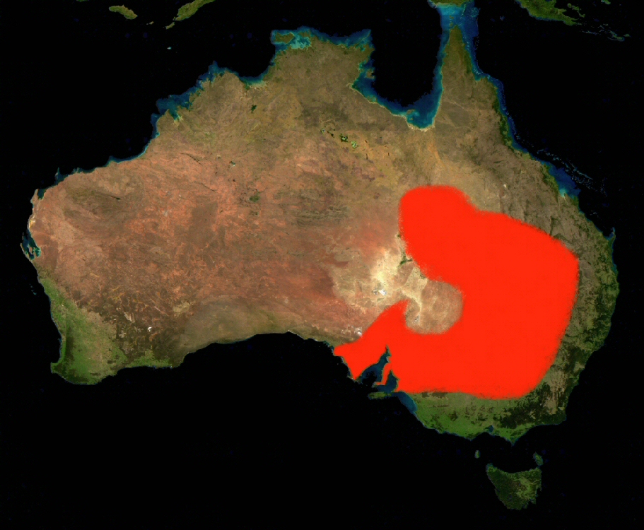 The southern extent of the range of the Inland Carpet Python encompasses in the area from the Eyre Peninsula in South Australia, east along the northern edge of Victoria. This taxon inhabits most of the interior of New South Wales and of southern Queensland, west of the Great Dividing Range.