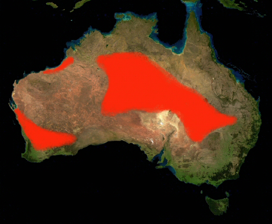 Womas have a large distribution in the Australian interior, occurring in the interior portions of New South Wales, Queensland, Northern Territory, South Australia and Western Australia. There are two other possibly disjunct populations of Aspidites ramsayi. In Western Australia there is a population along the coastal portions of the Pilbara and the Kimberley. The second possibly disjunct population is that of the rare southwestern woma. The southwestern population extends from the coastal areas of the southern third of Western Australia, eastward to the Nullarbor Plain. There is debate as to whether these two populations are in fact isolated or if gene flow occurs between these three areas.
